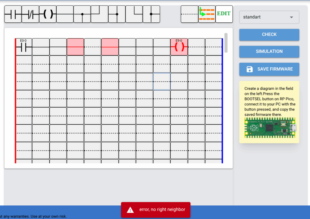 При разработке лестничных диаграмм как, впрочем, и в программировании на каком ни будь компьютерном языке программирования возможны два вида ошибок. Первый вид ошибок это синтаксический. Он легко выявляется программой при нажатии кнопки CHECK. Компоненты содержащие ошибки окрашиваются в красный цвет.