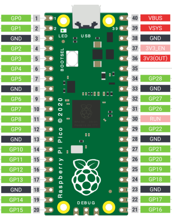 - You should use the pins marked from GP0 to GP28 (highlighted in green in the diagram). But note: GP25 is used by the built-in LED.